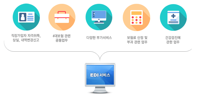 건강보험 EDI 서비스를 통하여 직장가입자 자격취득, 상실, 내역변경신고 업무를 처리할 수 있으며 4대 보험 관련 공통업무, 보험료 산정 및 부과 관련 업무 등도 간편하게 처리할 수 있습니다.