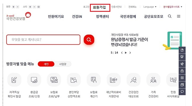 1) 건강보험공단 홈페이지(http://www.nhis.or.kr) 접속하시어 회원가입을 클릭합니다.