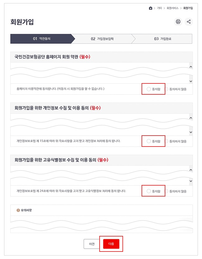 3) 약관 동의사항 확인 후 다음버튼을 클릭합니다.