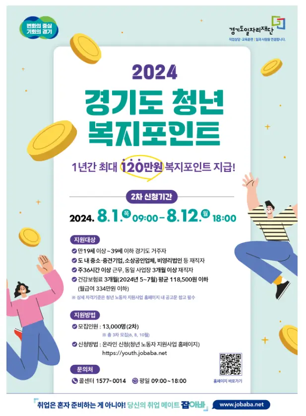 경기도 청년 복지포인트는 경기도 내 거주하고 있는 청년 노동자가 직장에서 일을 마친 후, 건강한 삶과 생활의 활기를 위해 보탬이 되고자 복리후생을 지원하는 사업으로 연간 총 3만 6천 명 내외 모집 예정입니다. 6월 1차 신청 완료, 8월에 2차 신청으로 13,000명 모집, 10월에 3차 신청이 예정되어 있습니다. 지원받은 포인트를 통해 건강관리, 문화생활, 자기계발 등 다양한 상품을 자유롭게 이용하실 수 있습니다.