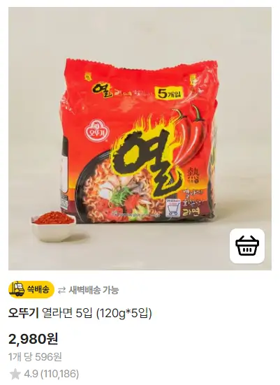 | 오뚜기 열라면 | 5입 | 2,980원 |