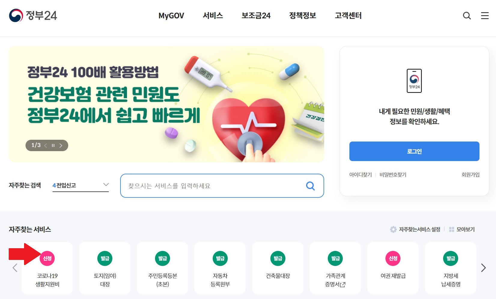 1) 온라인 신청가능 여부확인 (정부24 홈페이지 접속 - 자주 찾는 서비스 - 코로나19 생활지원비 신청 선택)