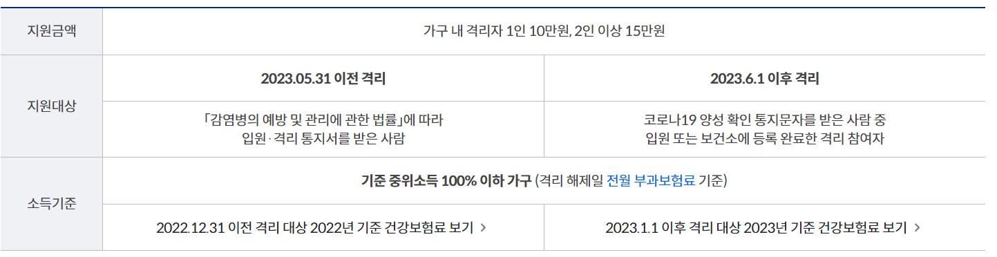 현재 기준으로 지원 금액은 가구 내 격리자 1인 10만 원, 2인 이상 15만 원이 지급됩니다.
