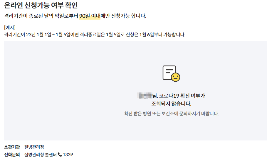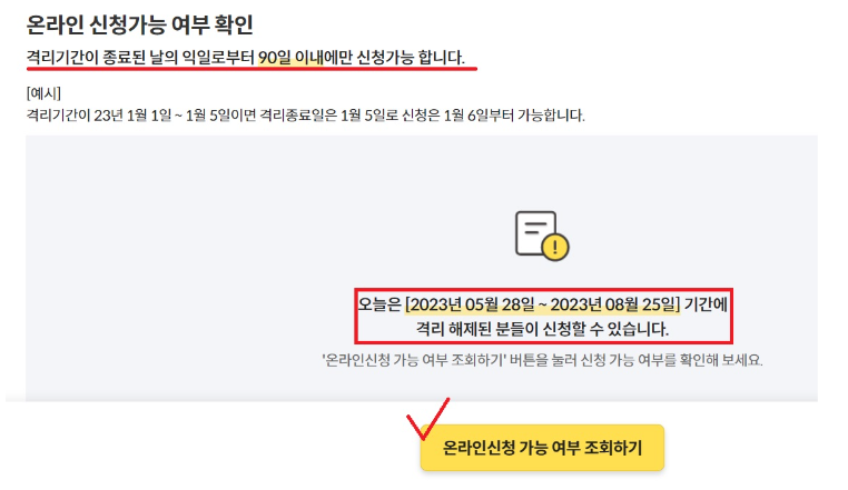 신청기한은 격리기간이 종료된 날의 익일부터 90일 이내 신청이 가능하며 오늘 날짜 기준 90일 이내 날짜를 계산하여 보여주므로 참조하시기 바랍니다.