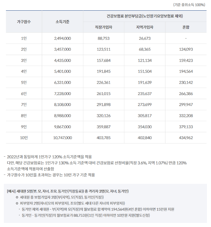 지원금 대상은 코로나19 양성 확인 통지 문자를 받은 사람 중 입원 또는 보건소에 등록 완료한 대상이며, 이는 기준 중위 소득이 100% 이하 가구 대상으로 가정의 인원 수와 소득에 의해 결정되기 때문에 건강보험 아래 산정기준표 참조하시어 본인 건강보험 부담금을 확인해 보시기 바랍니다.