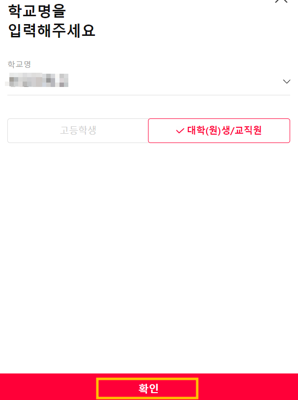 5. 학교명을 입력하고 확인 버튼을 클릭 후, 학교 이메일로 본인 인증을 합니다.