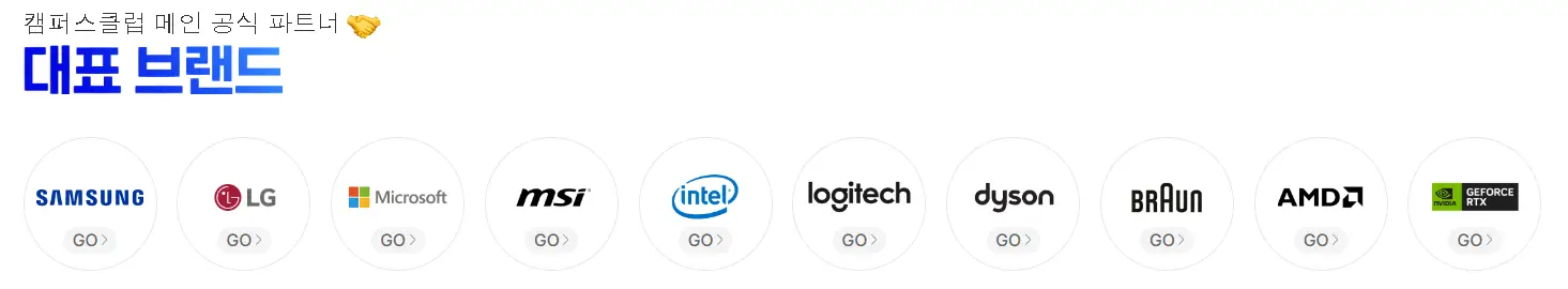대표 브랜드 상품관은 캠퍼스클럽 메인 공식 파트너로 삼성전자, LG전자, 마이크로소프트, MSI, 인텔, 로지텍, 다이슨, 바론, AMD, 지포스, 테팔, 현대리바트 등이 있으며 입점 브랜드와 상품은 지속 확대할 계획입니다.