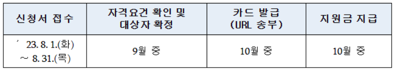 휴대폰 문자로 대상자 선정발표가 10월 중 안내되고 그 후 카드가 순차 발급되어 지원금은 체크카드 포인트로 반영 됩니다.