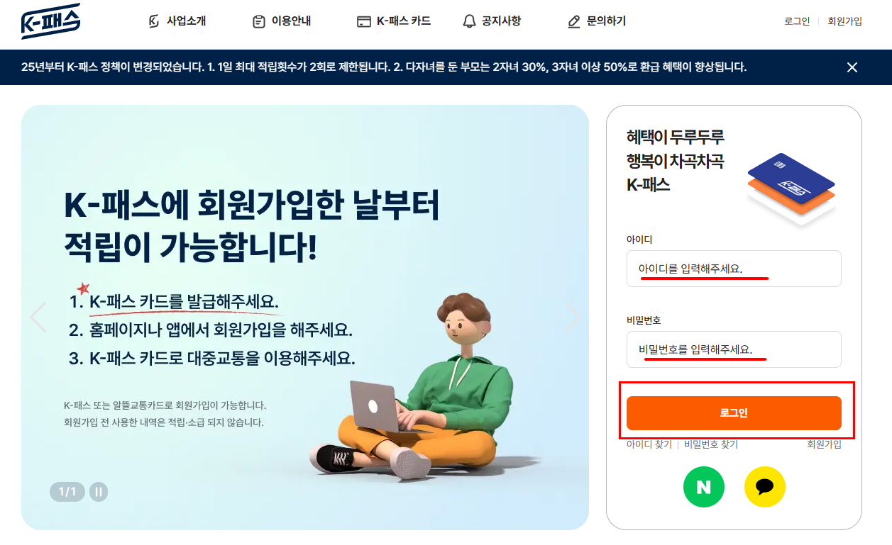 k패스 홈페이지에서 재등록하는 방법도 앱과 절차가 거의 동일합니다.