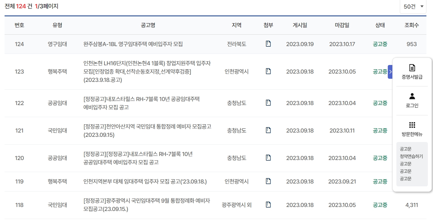 임대주택, 분양주택 등의 공고문을 보시면 공고 중인 것과 접수 중인 청약 정보가 유형별로 확인해보실 수 있습니다.